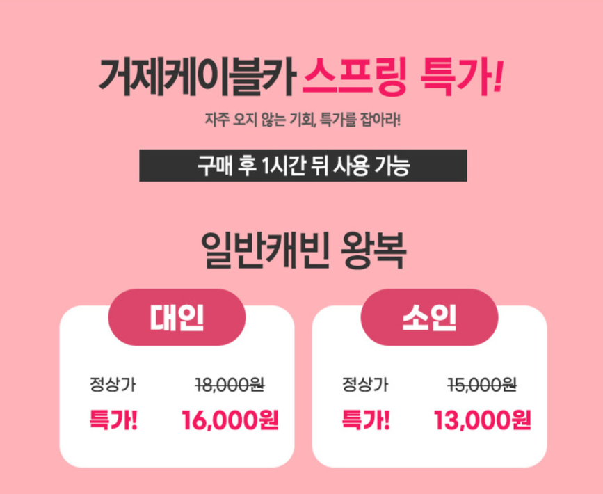 - 성인 1인: 정가 15,000원 → 할인가 13,000원 (약 13% 할인)