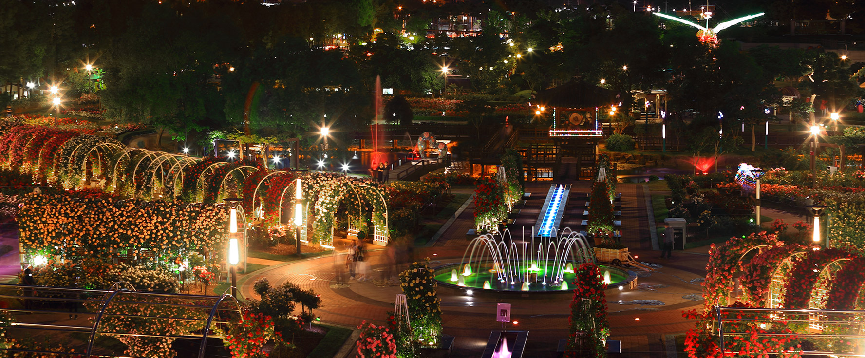 밤에는 LED 조명이 장미 정원을 환상적으로 비춰 로맨틱한 분위기를 느낄 수 있습니다.