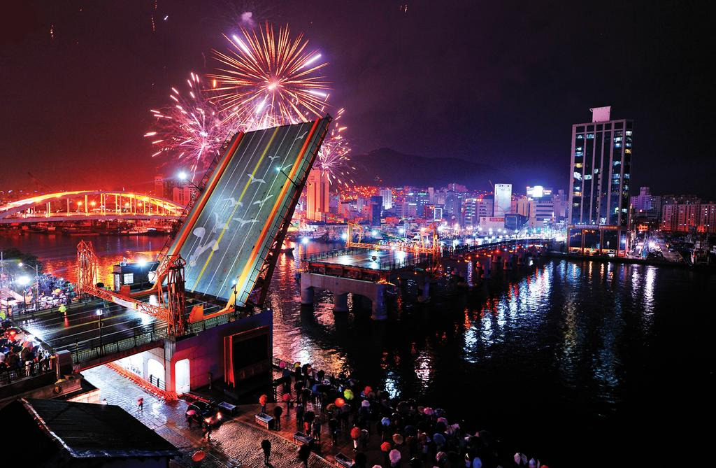 부산의 항구도시 속 바다와 다리를 배경으로 펼쳐지는 영도다리축제에서