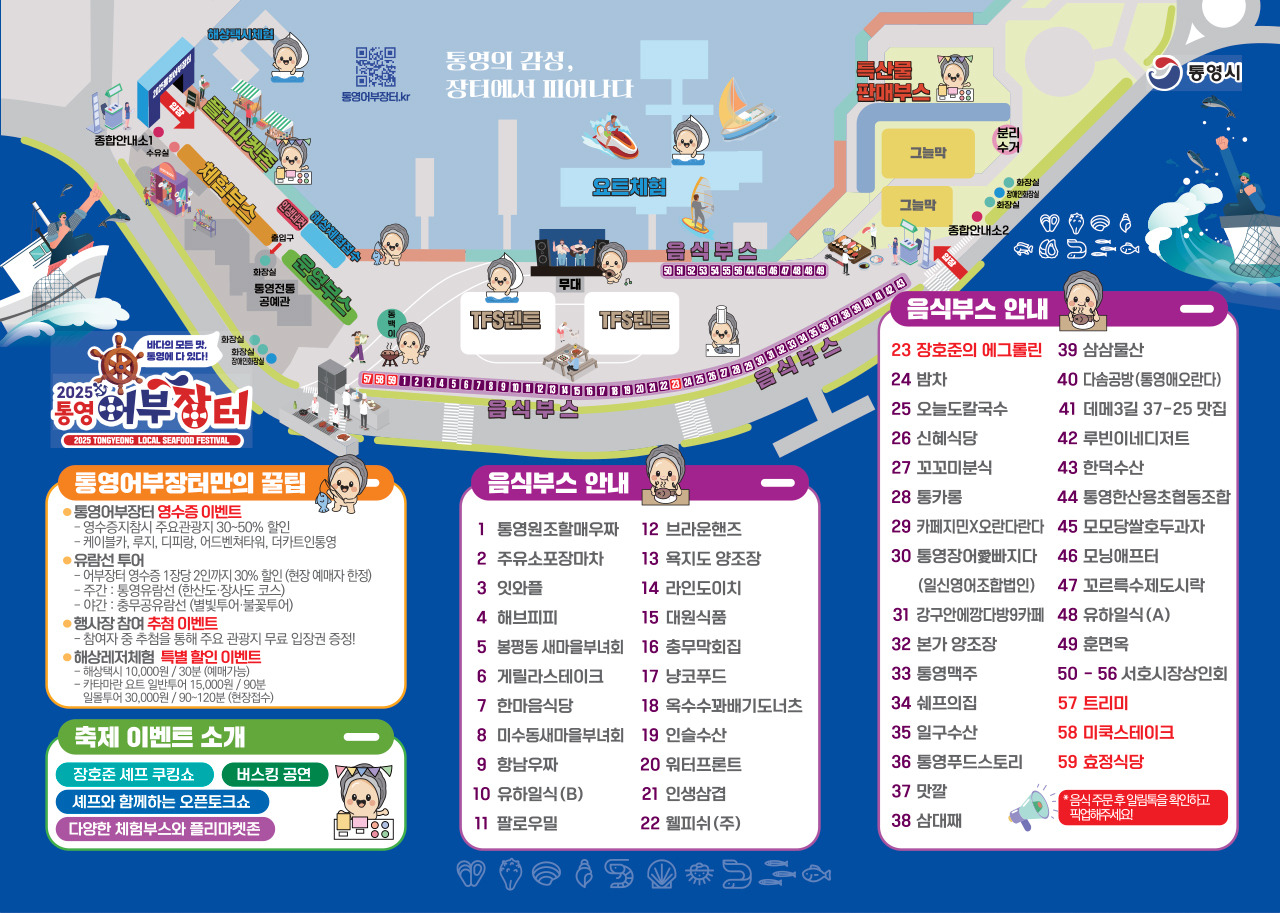 | 수산·로컬푸드 부스 | 통영 굴·멍게·멸치 등 시식·구매 | 현장가 | 바다 특산물 비교·쇼핑 |