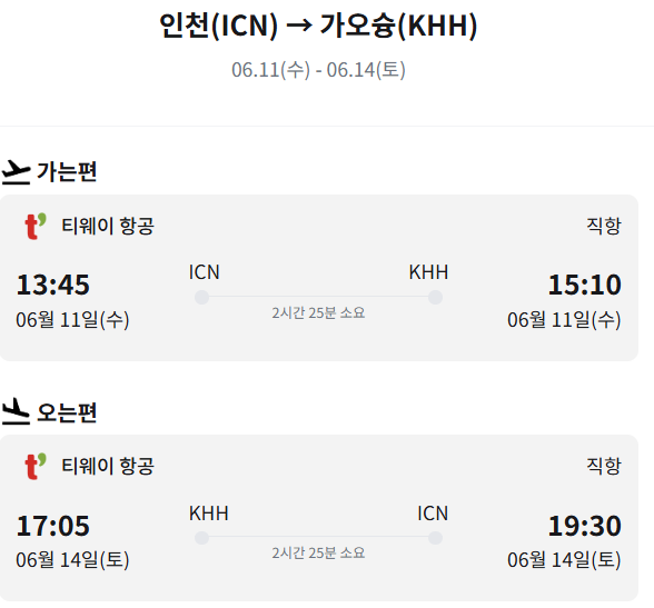 ⌛ 출발 시각: 인천 13:45 ✈ 가오슝 15:10 도착